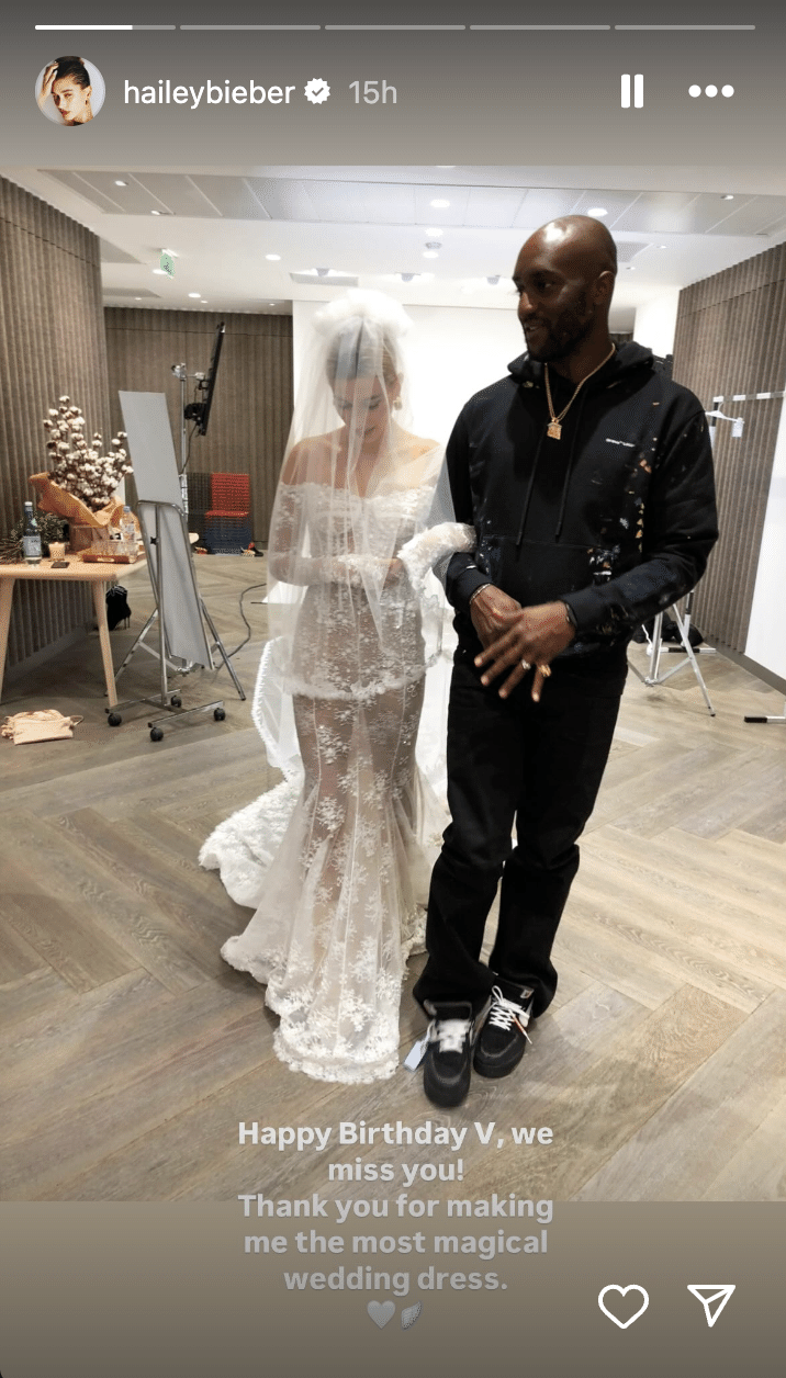 「誕生日おめでとうV、私たちはあなたが恋しいです! 最高にマジカルなウエディング・ドレスを作ってくれてありがとう」とのキャプションにヘイリーが添えたのは、ウエディング・ドレスを着た彼女とデザイナーが並んで歩いている写真。