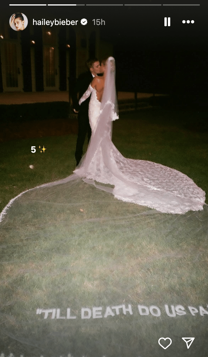 この日は結婚式から5周年となる記念日でもあり、彼女とジャスティンがキスをしている結婚式当日のスナップ写真も投稿。アイコニックなベールには、「死がふたりを分かつまで」とあり、5周年を意味する「5 ✨」の文字も。ふたりはニューヨークの裁判所で2018年9月13日に入籍、一年後にサウスカロライナで盛大な結婚式を挙げています。