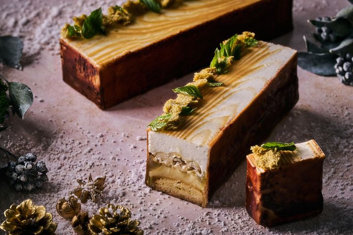 シェフパティシエ ノルマン・ジュビン氏オリジナルのブッシュ ド ノエル。柑橘のフレッシュな酸味とレモングラスやミントなどのハーブの香りが特長で、クリスマスディナーの後にも軽やかに楽しめる一品。