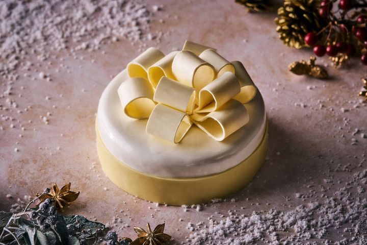 ホワイトチョコレートのリボンをあしらった、ギフトボックスのようなクリスマスケーキ。ココナッツミルクを使ったムースで、さわやかな酸味のライムとココナッツのミルクジュレと、さくっとした食感のサブレを包んでいます。