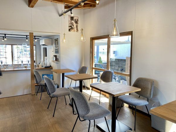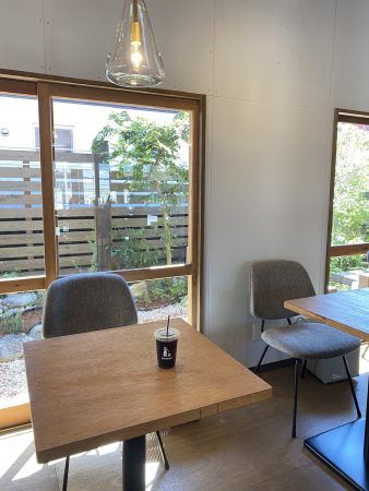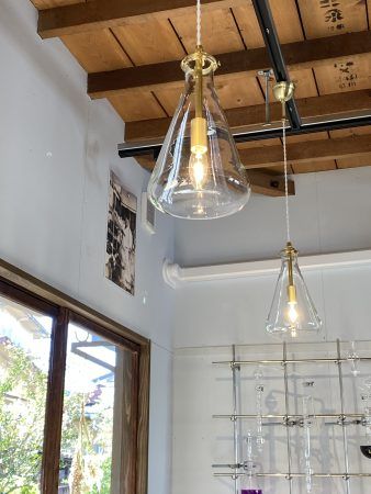 テーブル席があり、大きなガラス戸から光が入り、外の緑も見えて気持ちのいい空間。照明が三角フラスコ!かわいい!