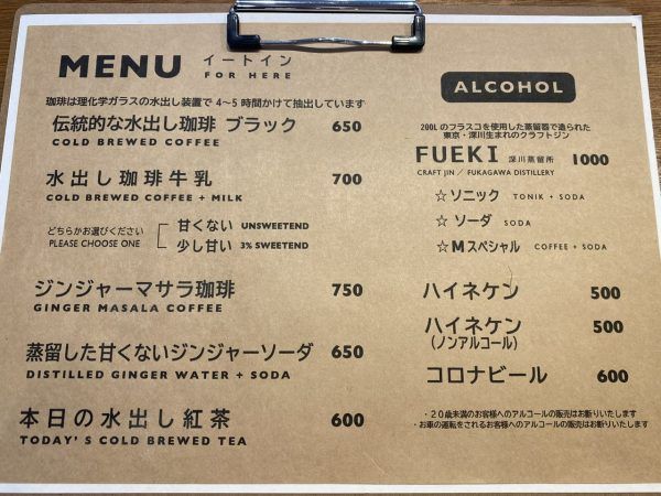 イートインのメニュー、クラフトジンなどアルコールもありました。深川蒸留所で造られてるというクラフトジン。