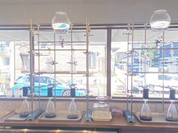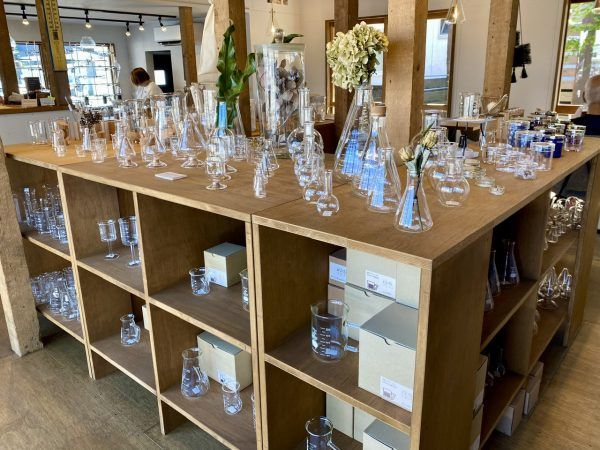 店内はビーカーやフラスコ、実験器具が並んでいて、美しくディスプレイ。