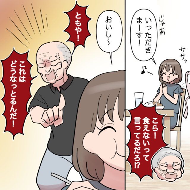 「食えないって言ってるだろ!?」「ともや!これはどうなっとるんだ!」怒り出す義理の祖父母のに全く動じません。