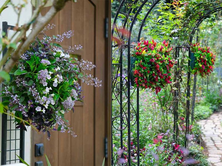 ハンギングバスケットとは、植物を空中に吊るして楽しむガーデニング手法の一つ。球体や半円状の容器に植物を植え込み、チェーンやフックで壁や天井、または庭の構造物などに吊るして飾ります。ハンギングバスケットは地面を使わずに空中を華やかに彩ることができるので、玄関先やベランダなどで楽しめるのが魅力です。