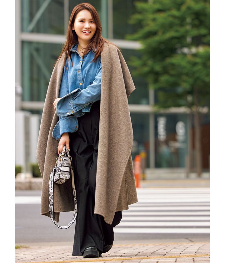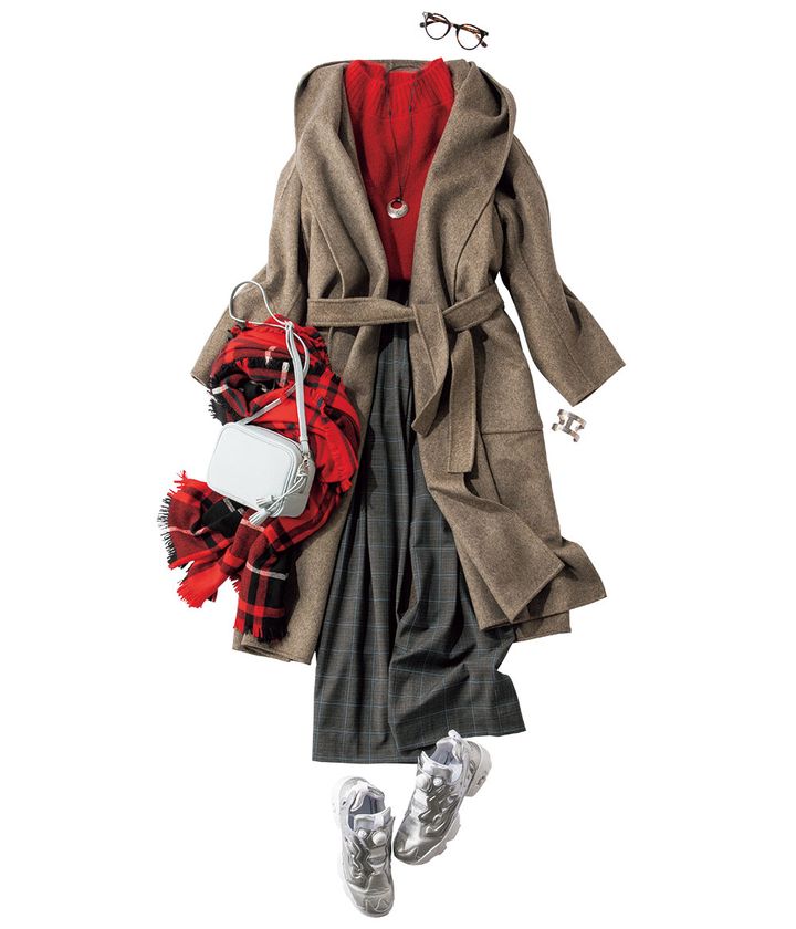 コート私物 ニット¥38,500(エッフェ ビームス/ビームス ハウス 丸の内)パンツ¥44,000(ソブ/フィルム)バッグ¥37,400(ヴァジック/ヴァジックジャパン)ストール¥45,100(アソースメレ/アイネックス)スニーカー¥25,300(Reebok)メガネ¥42,900(アイヴァン/アイヴァン 東京ギャラリー)ネックレス¥25,300バングル¥64,900(ともにアダワットトゥアレグ/The Edit store)
