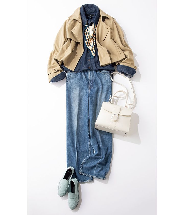 バッグ私物 ショートトレンチコート¥35,970(ネイヴ)シャツ※8月下旬発売¥14,000(バナナ・リパブリック)デニムパンツ¥28,600(アッパーハイツ/ゲストリスト)ローファー¥147,400(ピエール アルディ/ピエール アルディ 東京)スカーフ¥1,990(MANGO)