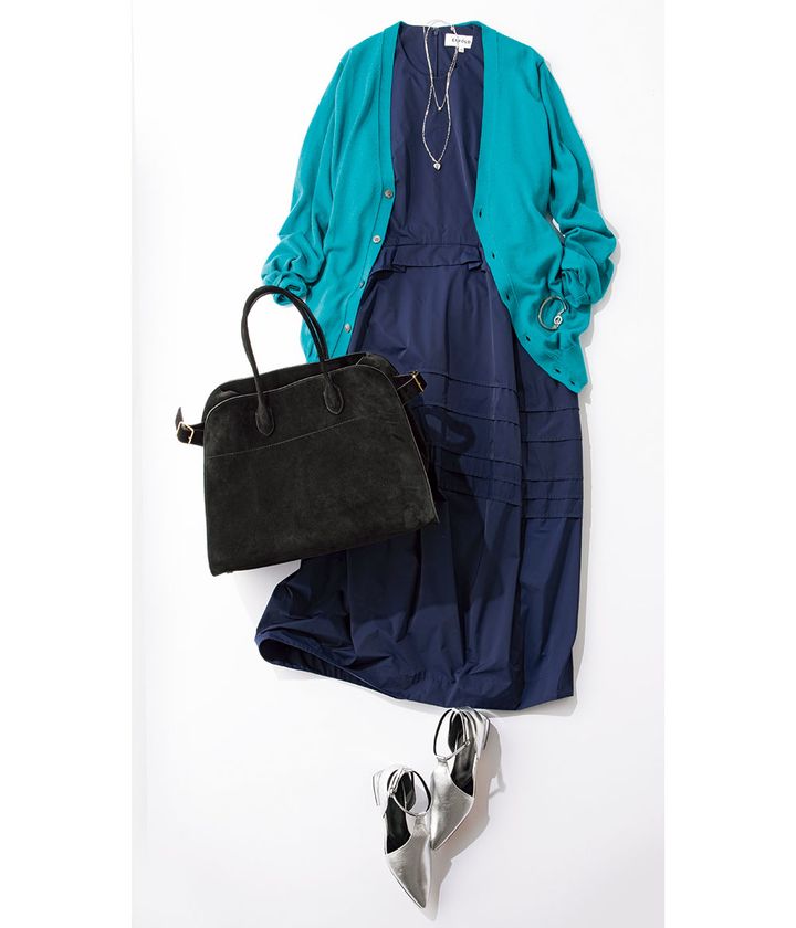 バッグ私物 カーディガン¥29,700(スローン/ザ ショップ スローン 新静岡セノバ店)ワンピース¥60,500(エンフォルド)フラットシューズ¥30,800(銀座かねまつ/銀座かねまつ6丁目本店)ハートネックレス¥39,600ネックレス¥28,600(ともにマリハ)バングル¥7,560(アビステ)