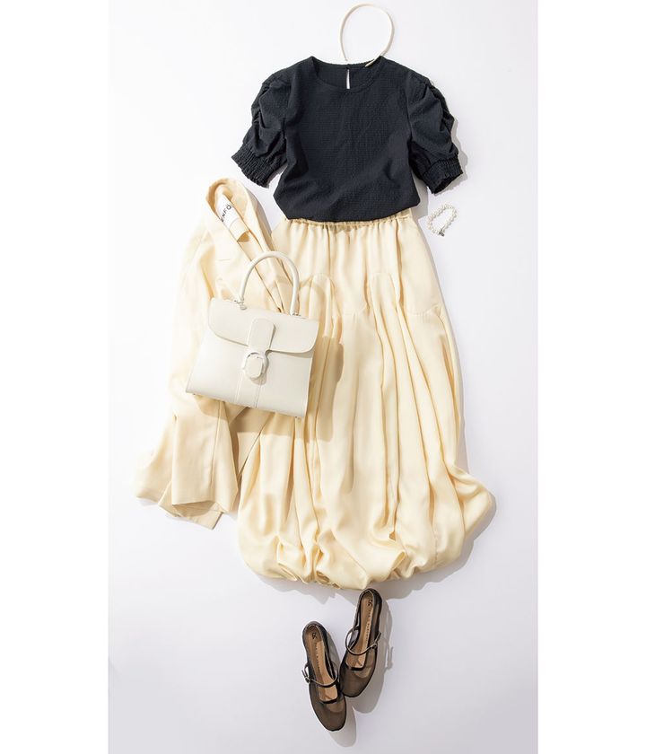 60代は程よく甘さを残して柔らかい印象に。甘トップスとモードなバルーンスカートにメッシュシューズで抜け感を。(スタイリスト MaiKo yoshidaさん)