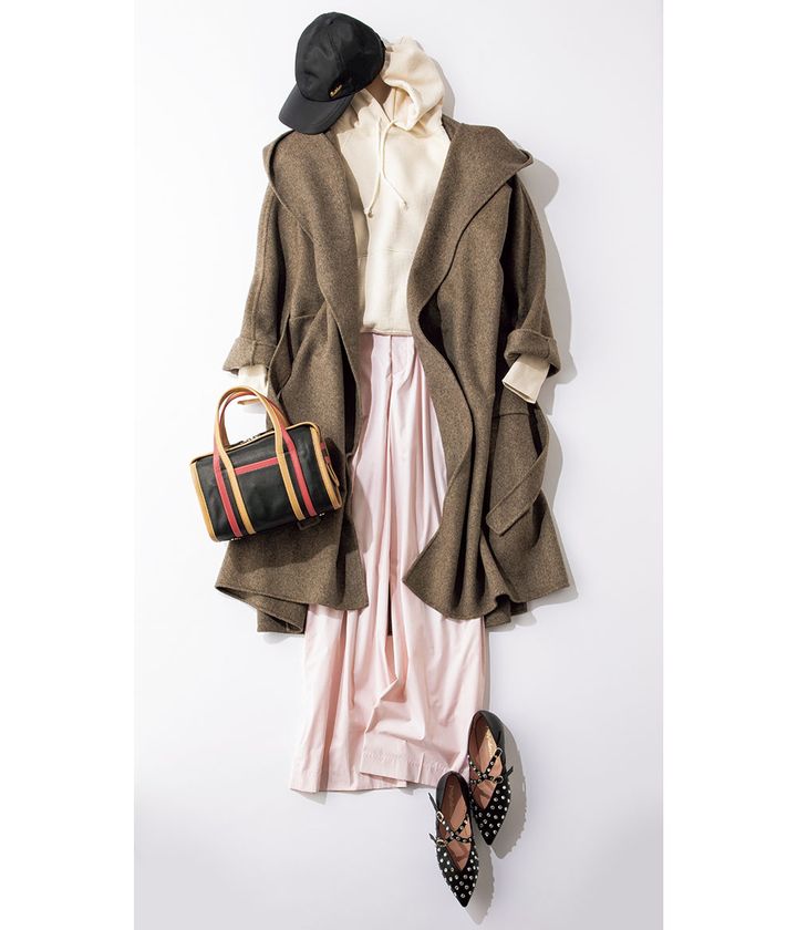 コート私物 パーカ¥18,700(ドレステリア/ドレステリア 渋谷スクランブルスクエア店)パンツ¥19,910(リネイヴ/ネイヴ)バッグ¥193,600(ピエール アルディ/ピエール アルディ 東京)フラットシューズ※8月中旬発売予定¥62,700(プリティ・バレリーナ/F.E.N.)キャップ¥31,900(ボルサリーノ/中央帽子)