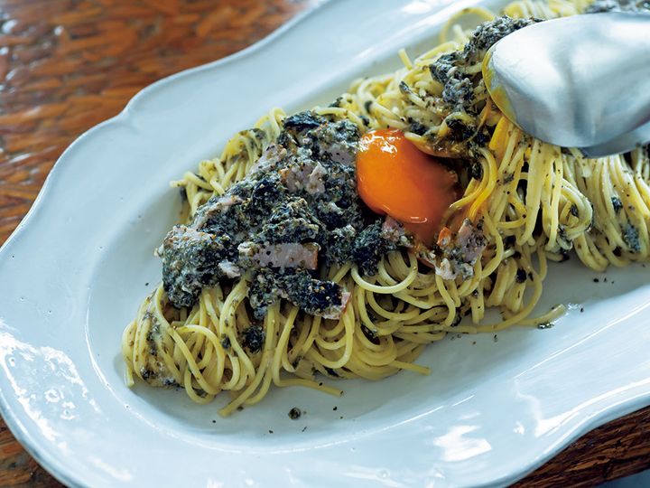 ❹器に盛りつけ卵黄をのせ、チーズをかける。