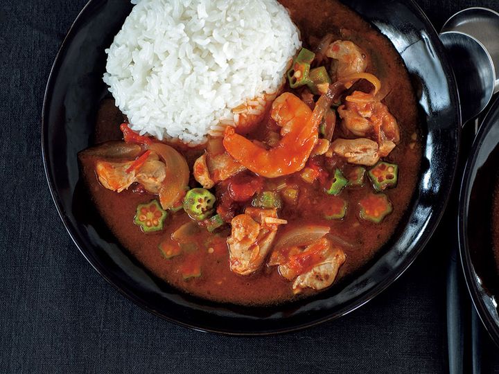 ❶にんにくはみじん切り、玉ねぎは薄切り、セロリは粗みじん切り、鶏肉はひと口大に切る。オクラは塩を軽く振りまな板にこすり、水で洗いガクとヘタを取り5㎜幅の輪切りにする。