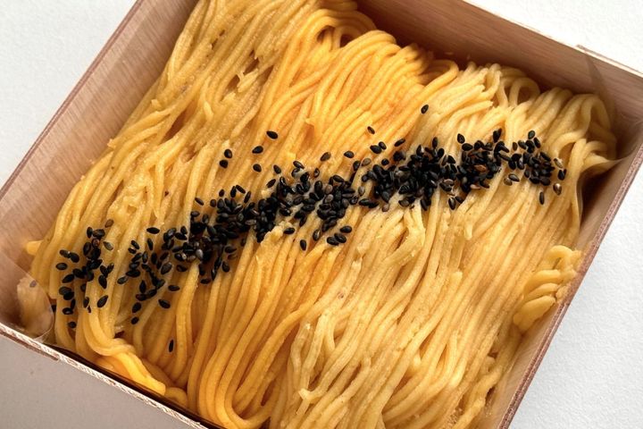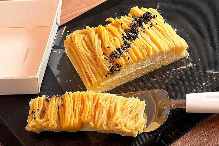 蓋を開けると、たっぷりのモンブランクリームと、斜めに配された黒胡麻が目に飛び込んできます。