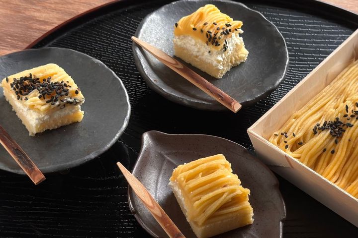 「成城石井 3種さつま芋食べ比べ贅沢モンブラン」は、お芋の種類で分けて、ひと口サイズにカットして楽しんでも。この季節ならのお芋スイーツを存分に楽しみましょう。