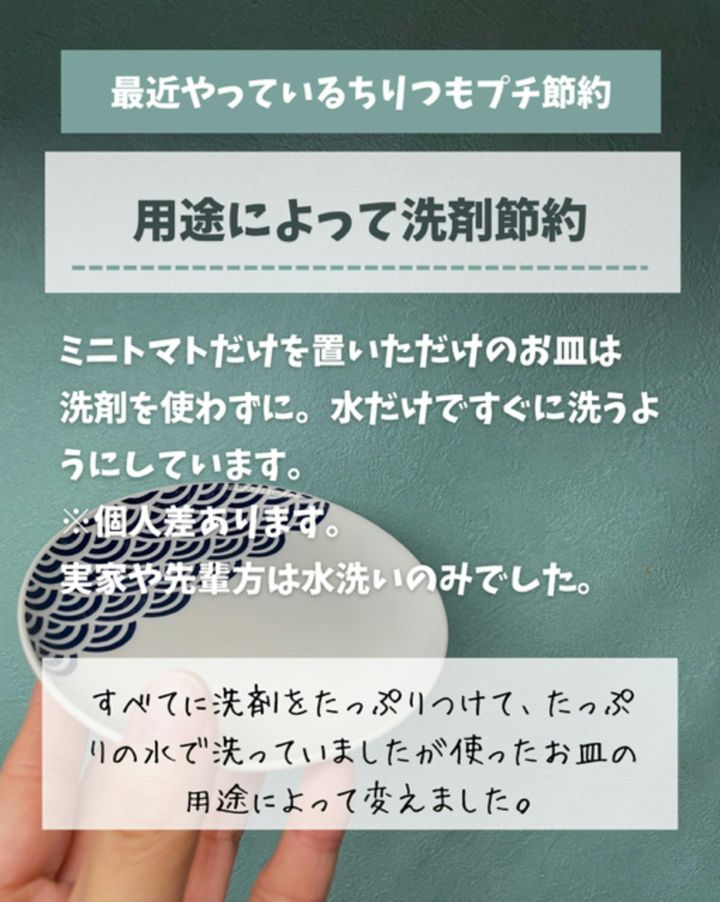 これは祖母が実践していた方法ですが、油ものがついた皿以外は水だけで洗って、エコかつ食器用洗剤を大切に使っていました。以前のわたしはすべて食器用洗剤をつけて洗って、水もじゃぶじゃぶだしていました。