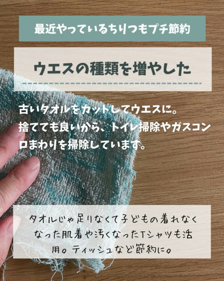 使い古したタオルなどをカットして、雑巾や布巾などにするウエスをわが家でも活用していました。以前は使いやすいからとタオルだけウエスにして使っていましたが、なかなか使い古したタオルは出ませんでした。ウエスがないわが家では、子どものサイズアウトした肌着や汚れが目立つTシャツなどをウエスにするようになりました。