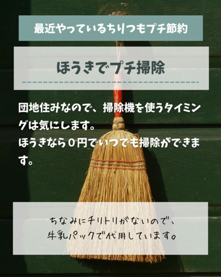 クイックルワイパーなどは使用せず、ほうきで掃除すれば電気も消耗品も使わず、いつでも0円でできます。