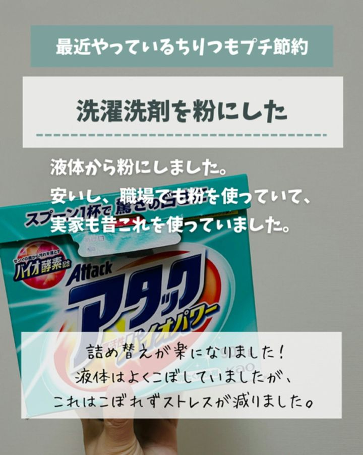 液体の洗濯洗剤より粉の洗剤の方が安いことに気がつきました。さらに、よく液体洗剤の詰め替えでこぼして無駄にしてしまったことがありましたが、粉洗剤にすることにより入れ替えが楽になり、無駄も減らすことができています。