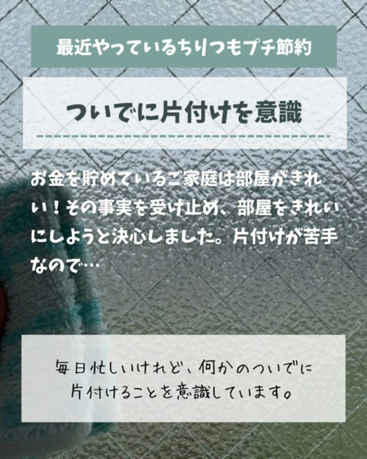 わたしがやっていることは、ついでに片づけることを意識すること。すぐ片づけることによって頑固な汚れ取りも不要になり、部屋が整い外出を減らすことができました。部屋が汚い、整っていないとお金は出ていきやすくなるのだとようやく気づくことができました。