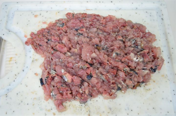 1.小骨を切るように、さんまを細かく包丁で叩いてミンチ状にする。