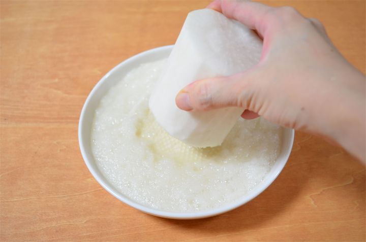 5.大根の皮を剥き、すりおろして水気を切る。