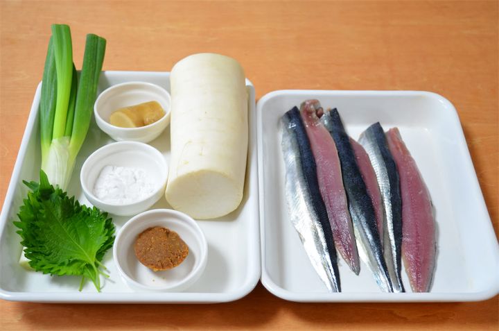 中には叩いてミンチ状にしたさんまと、ねぎやしょうがの薬味がぎっしり詰まってます。