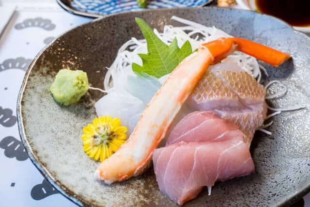 本日の地魚は、鯛、ウスバハギ、赤身はカジキで、身が締まっていて歯応えがある日本海の魚らしいお刺身です。カニの足は風味豊かでさっぱりといただけました。