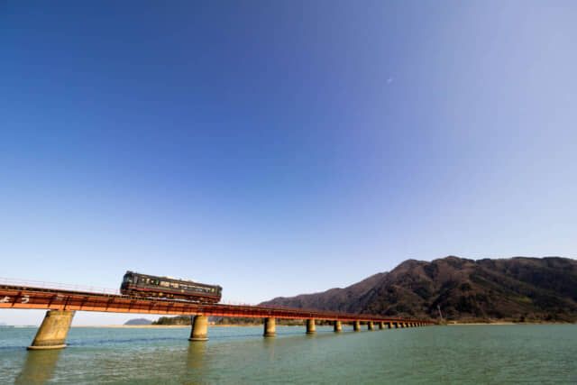 由良川の河口に架かる由良川橋梁は、水面約6m の高さを一直線に約552m続く鉄道橋で、鉄道ファンのみならずフォトジェニックなスポットとして人気です。車内から見ると、まるで水面を走っているような、唯一無二の列車旅を味わえます。