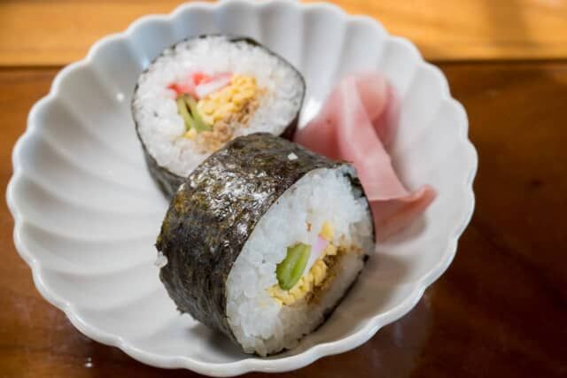〆のご飯は丹後地方の郷土料理 “ばら寿司” を、巻き寿司にして提供。甘く煮つけた鯖のほぐし身や野菜などが巻かれていて、揺れる車内でサッと食べられるメニューです。