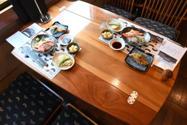 天橋立駅を出発すると同時に食事が始まります。料理は舞鶴にあるお洒落な魚屋さん兼レストラン「サカナテラス」がプロデュース。料理に合わせてペアリングする日本酒は、京丹後地域にある酒蔵3軒のお酒を試します。
