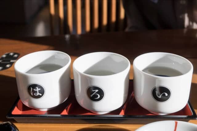▲本日の地酒は「い、ろ、は」と書かれたおちょこで飲みくらべ