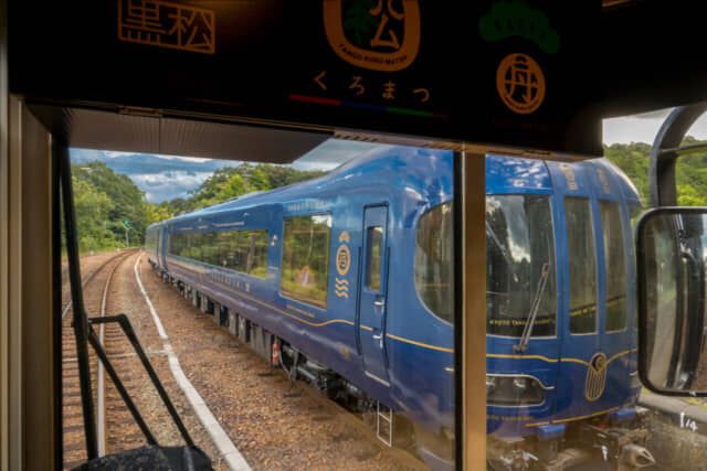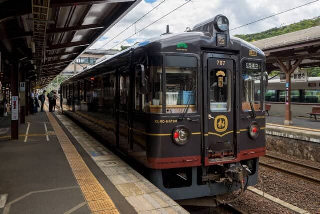黒いボディカラーにゴールドのラインが美しい「丹後くろまつ号」。デザインは「ななつ星 in 九州」や「或る列車」などを手がけた工業デザイナーの水戸岡鋭治氏。内装にも木材が使われ、上質さとレトロな雰囲気を備えた走るレストランです。