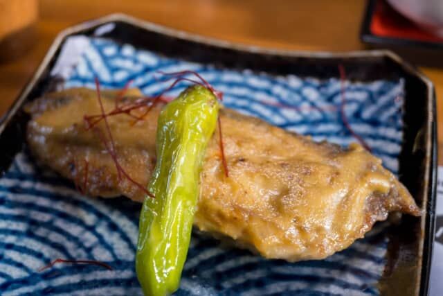 この日の地魚料理は、淡白な白身魚のシイラに、コクのあるカニ味噌を塗って焼き上げた一皿。緑が鮮やかな万願寺唐辛子が添えれていました。
