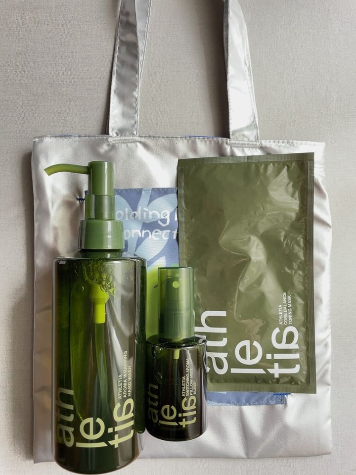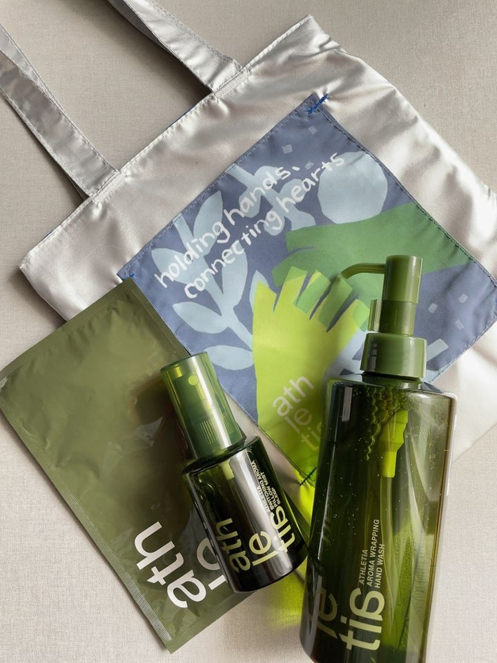 続いてはギフトにもピッタリなアスレティアのキット。キットと同日に新発売するハンドウォッシュ、心地よく深い眠りにつけると人気のピローミスト、うるおいで肌を満たしてくれるローションマスク、それぞれなんと現品が絵描き・Lee Izumidaさんによるオリジナルバッグと一緒になりました。