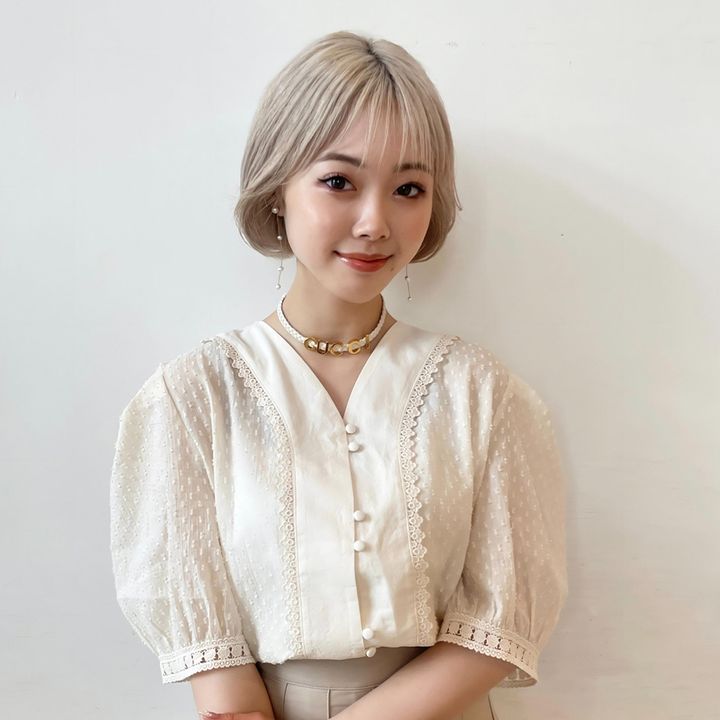 しっかりレイヤーで切り込むことで、トップの高さをキレイに演出。自然と目線が上に上がるから、見る人にポジティブな印象を与えてくれます。前髪は目の上で丸みをつけて。