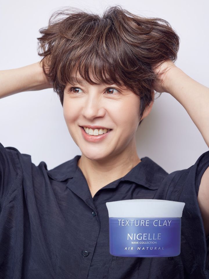 ふんわり感を生かすべく、スタイリング剤はファイバーワックスを選択。束感が出て1日崩れ知らず。全体になじませたら、耳まわりやえり足などの毛先は再度しっかりつけて。ニゼル テクスチュアクレイ 120g ¥2,420*美容室専売品/ミルボン(TEL 0120-658-894)