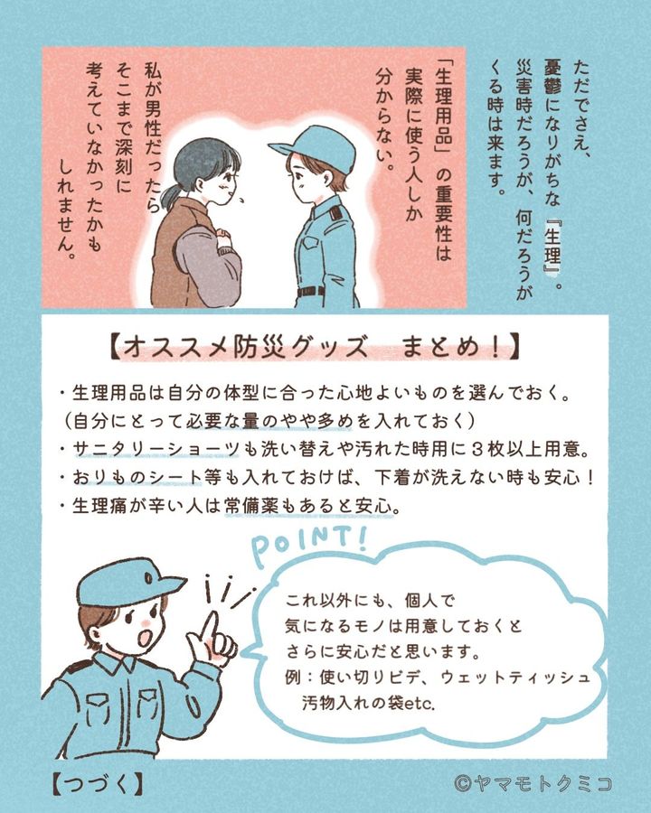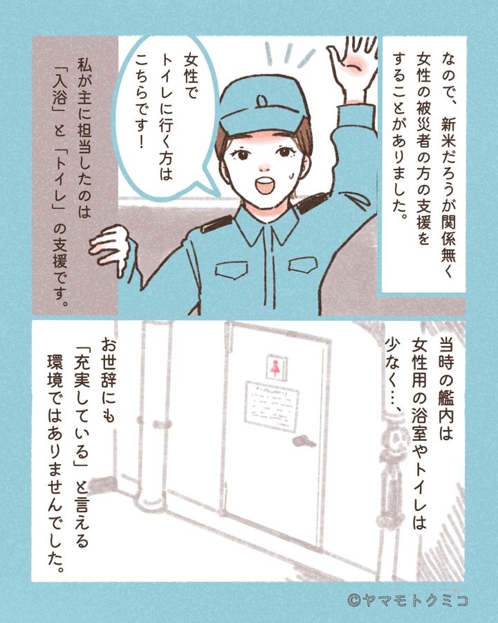 私が自衛隊にいた頃は、職場の上官がほぼ男性だったこともあり、災害時における生理用品の重要性について、主張する機会を設けることがあまりできませんでした。きっと、災害にあわれた女性も、男性の自衛官には相談がしにくかったのではないでしょうか。