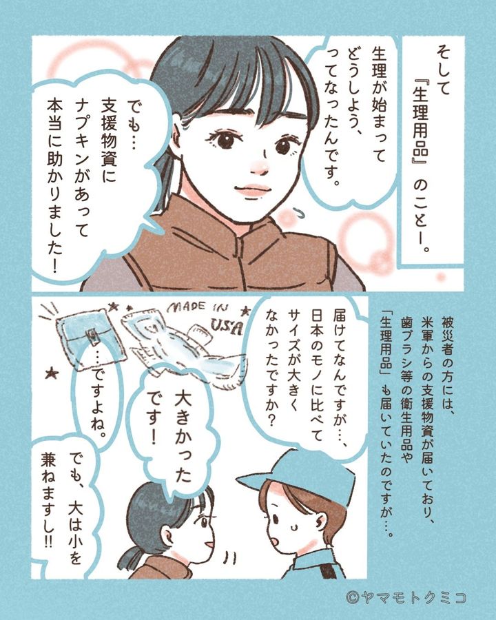 地震が発生してから、派遣されるまでの直前の買い出しは、ほとんど時間がなく、生理用品については「もっと事前に準備しておけば…」と後悔することもありました。