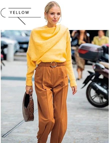 強さのある原色のニットを着るときに合わせたいのがキャメル。たとえばイエロー+黒ボトムだと、コントラストが強くて難しく見えがち。そんなときも、イエローに近いトーンの近い、キャメルを合わせたこの着こなしは、上下の色がいいぐあいになじんで、大人っぽい雰囲気に。
