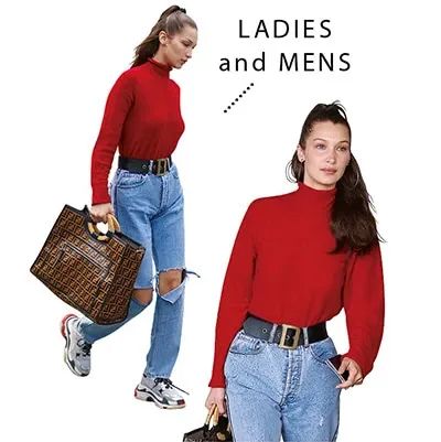 60年代のオードリー・ヘプバーンを彷彿させるのは、鮮やかな赤ニットとあせたブルージーンズを合わせたモデルのベラ・ハディッド。いい意味でやぼったさのある組み合わせを、潔くタックINしてよりレトロに仕上げたのも魅力的。