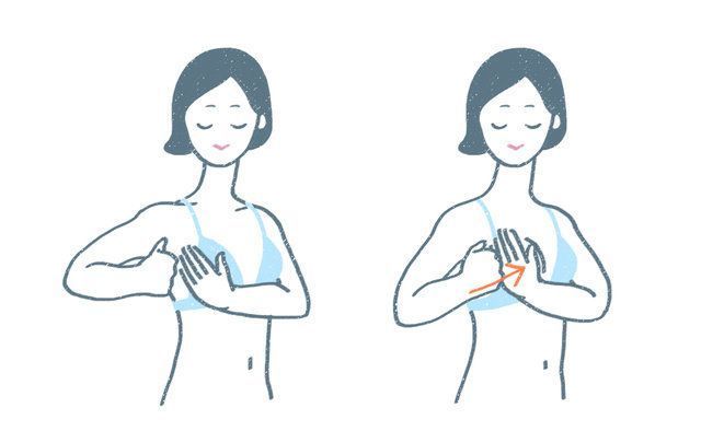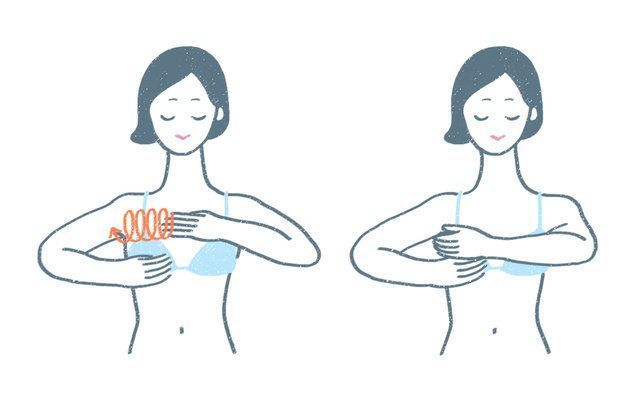 最後におっぱいに正しい位置を覚えさせるよう、両手をパーにして脇からバストの下側を支え、内側に寄せて30秒キープする。その後じんわりと離す。