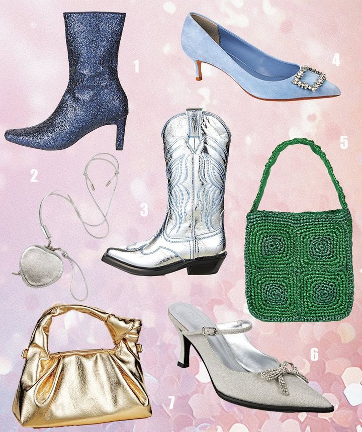 1.夜遊びに行く時はこんな華やかなブーツでBOYSの視線を独り占めしない? グリッターショートブーツ ¥17,600(LA BELLE ETU DE)。2.こちらなんとスマホストラップ。リップや小銭などの入るハートポーチつき。両手をあけたいママやアウトドア好きな方にオススメ。スマホストラップ ¥10,780(Stola.) 3.またじわじわとブーム到来中のウエスタンブーツは、こんなシルバーのアイテムで今どきに。ブルーの刺繍がアクセントとしてきいていてキュート。ウエスタンブーツ ¥59,900 (Desigual/デシグアルストア 銀座中央通り店) 4.ペールブルーのスエードシューズに、ビジューの飾りがきいているレディなパンプス。低めのヒールなので歩きやすさもばっちり。パンプス ¥31,900 (TSURU By MARIKO OIKAWA) 5.グリーンのビーズバッグは、お呼ばれや舞台鑑賞のときなどに便利!コンパクトなサイズなので、最低限のアイテムだけを入れて。ビーズバッグ¥35,200(Suryo/THE MOTT HOUSE TOKYO) 6.ぎっしりビジューのヒールの上にさらに、リボンのあしらいで、とことんフェミニンに。歩いているときにふと足元を見るたびに心躍る気分になるはず!ビジューハイヒールミュール ¥17,930 ※9月中旬頃入荷予定(LILY BROWN/LILY BROWN ルミネエスト新宿店) 7.ゴールドのバッグも、こんなしなやかな輝きであれば持ちやすい。肩にかけてきゅっとコンパクトに持ってもいいし、チェーンで肩からかけて使ってもOK!2wayゴールドハンドバッグ¥4,990(MANGO)