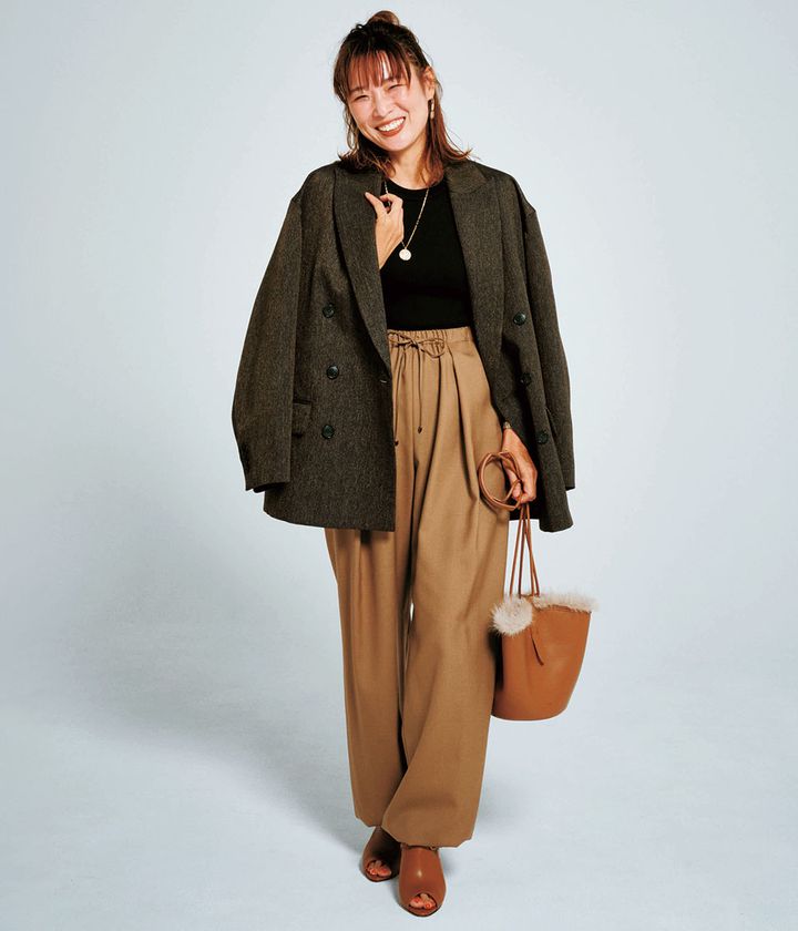 パンツ¥53,900(エイトン/エイトン青山)ブラウス¥15,400(ダブルスタンダードクロージング/フィルム)手持ちのジャケット。ジャケット¥124,300(ハウス オブ ダグマー/エリオポール代官山)バッグ¥198,000(J&M デヴィッドソン/J&M デヴィッドソン カスタマーセンター)靴¥37,400(PIPPICHIC/ベイジュ)ピアス¥35,200(ミショー/ハウス オブ ロータス)バングル¥55,000(メゾンヴァジック/ヴァジックジャパン)