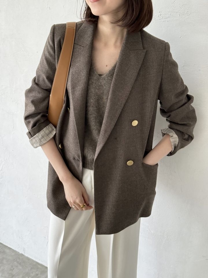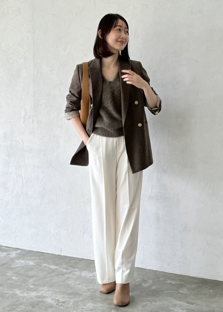 「今年気になるブラウンカラーをメインに、ホワイトのパンツでクリーンに仕上げました。ジャケットのインナーにファーニットを合わせて、異なる素材を掛け合わせたのもポイントです。トラッドになりがちなウールジャケットを、女性らしくしなやかで上品な着こなしにまとめました」