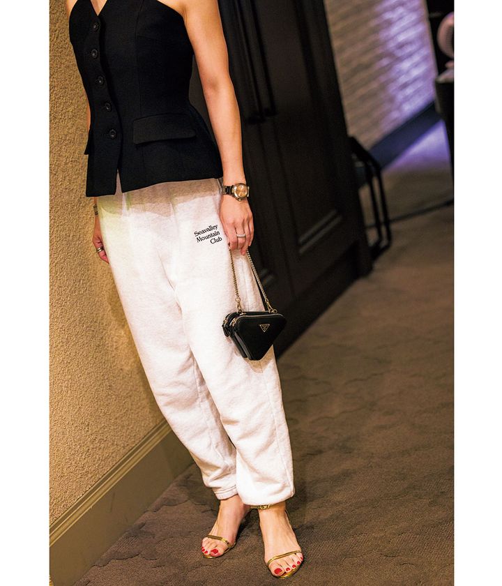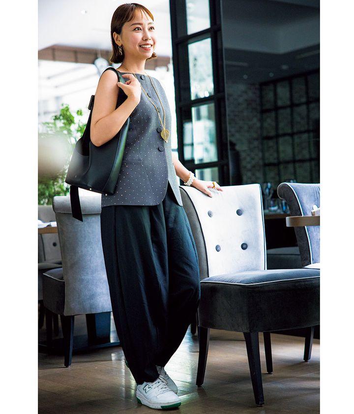『ゆるっとしたシルエットのパンツに、スパンコール付きのジレでメリハリをつけるのが今の気分。足元もスニーカーにして、とことんチルを加速させます。』