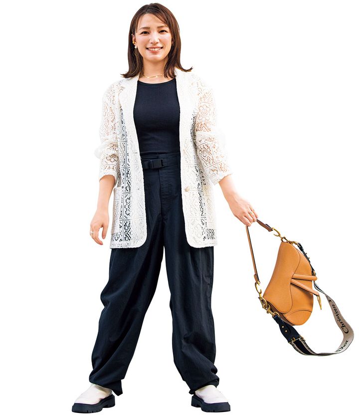 『1人映画時間は、心が緩むリラクシーなチル甘コーデが鉄則。太めのパラシュートパンツにレースジャケットで甘さと抜け感を。肌触りも大切にしています。』