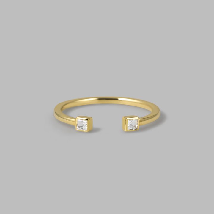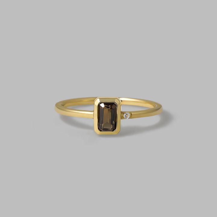 薬指:(K10YG×スモーキークォーツ×ホワイトトパーズ)¥90,200 中指:指元(K10YG×クリアクォーツ)¥68,200 指先(K10YG×スモーキークォーツ)¥68,200 人差し指:(K10YG×クリアクォーツ)¥110,000 ピアス(K10YG)¥15,400 イヤカフ 上(K10YG×ブラウンダイヤモンド)¥33,000 下(SV〈K18YGコーティング〉×スモーキークォーツ)¥15,400