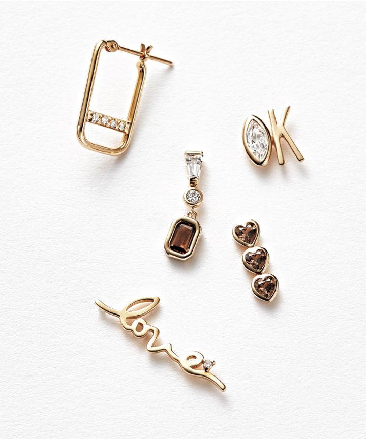 [右から時計回りに]アシンメトリーに着けたり、イヤカフと組み合わせたり。新ラインには、アレンジ自在なシングルピアスも豊富。 ①(K10YG×クリアクォーツ)¥19,800 ②(K10YG×スモーキークォーツ)¥24,200 ③(K10YG×ブラウンダイヤモンド)¥19,800 ④(K10YG×スモーキークォーツ×クリアクォーツ×ホワイトトパーズ)¥23,100 ⑤(K10YG×ブラウンダイヤモンド)¥30,800 (すべて4°C/エフ・ディ・シィ・プロダクツ)