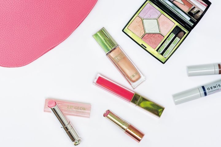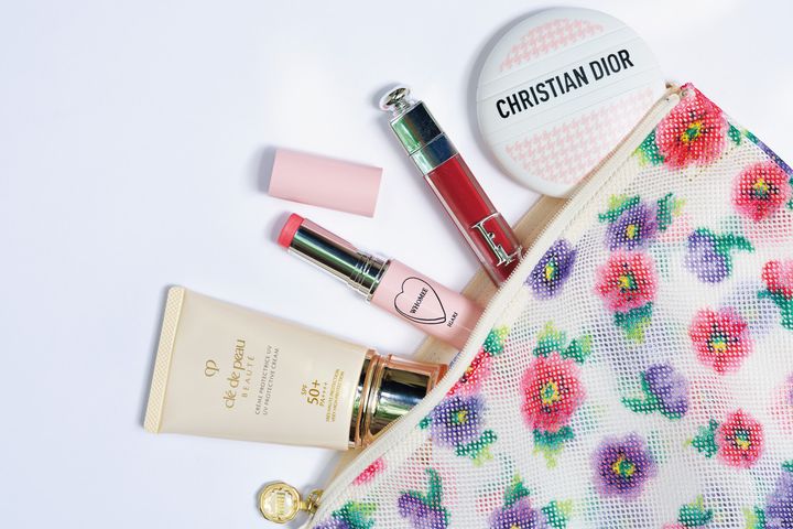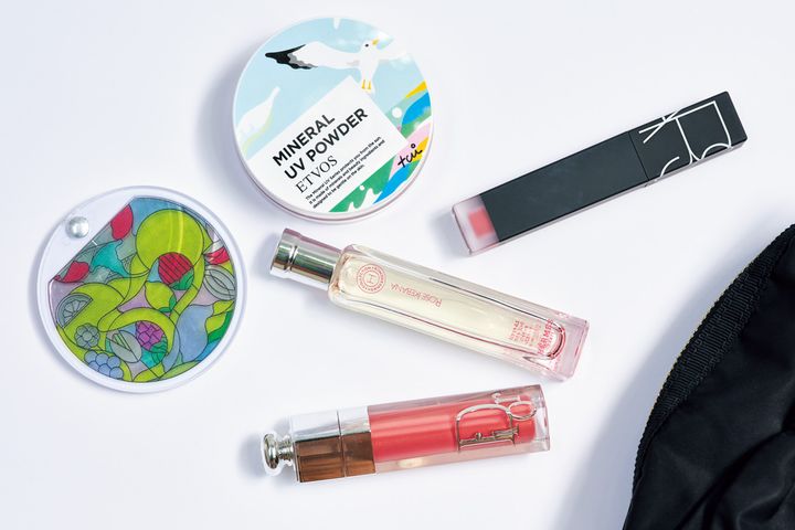 何個もリピしているクレポのUV下地は、持ち歩いて首にも塗り直して保湿。ツヤと透明感をしっかりキープし、Diorのリップマキシマイザー024とフーミーのグロウスティックで血色感をプラスして。Diorルボームは全身に使えるので重宝しています。デルヴォーのバッグは使うたびに布で拭き、汚れを残さないようにケア。
