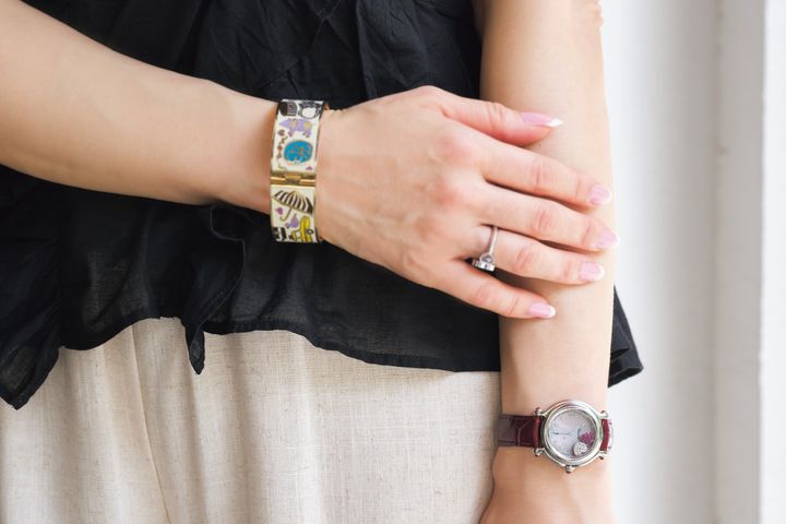 ETVOSのラベンダーUVパウダーは、メイク直しするたびに透明感がアップし、上品な大人のマット肌になるので夏に大活躍!NARSのリップティント 888にDiorリップマキシマイザー012を重ね、ふっくら艶やかな唇もキープ。バングルは数年前にNYのデパートで購入したもの。モノトーンコーデに遊び心を加えています。